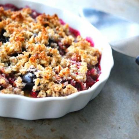 - Hienonna manteleita ja sekoita loppujen aineksien kanssa murotaikinaksi. Murenna taikinasekoitus marjojen päälle. Paista uunin keskiosassa n. 20 minuuttia.