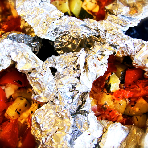 6. Revi alumiinifoliosta neljä reilua palaa ja jaa ainekset niille. Nosta folion reunat ylös, mutta jätä nyytit hieman auki.