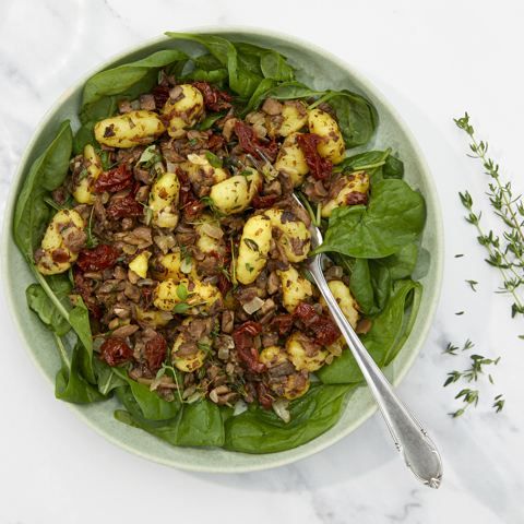 Gnocchipannu sienillä on arjen pikaruoka parhaimmillaan! Voit käyttää ruokaan myös kuivattuja sieniä. Liota silloin sieniä ja purista ylimääräinen vesi pois ennen ruokaan lisäämistä. Sesonkiaikana voit hyödyntää tuoreita sieniä.