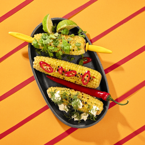 - Nosta kuumat tähkät lautaselle ja sivele joka puolelle haluamaasi voita/öljyä. Korianterivoilla silattujen maissien päälle voit ripotella tuoretta korianteria ja tarjota limelohkot ruokailijoiden puristettavaksi tähkien päälle. Ripottele chili-valkosipulivoilla voideltujen maissien päälle ohuelti viipaloitua tuoretta chiliä. Murustele tilliöljyllä siveltyjen maissien päälle feta/salaattijuusto