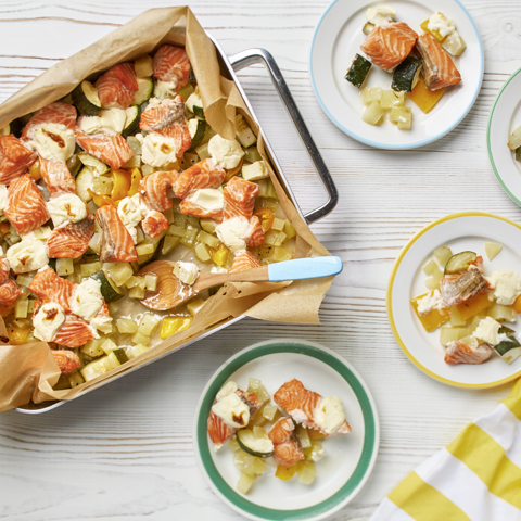 - Huuhtele kesäkurpitsa ja paprika. Halkaise paprika ja poista siemenet. Pilko perunat ohuiksi siivuiksi ja kasvikset reilunkokoisiksi suupaloiksi.