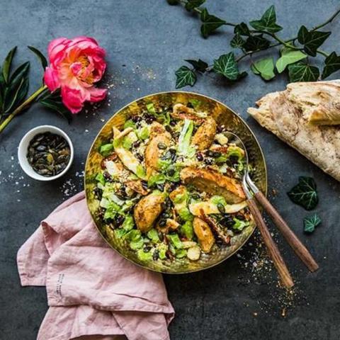 - Viipaloi jokainen kanan rintafilee kolmeen pitkään palaan ja paista voissa. Sekoita keskenään sinappi ja rypsiöljy ja voitele kanaviipaleet. Mausta suolalla, pippurilla ja persiljalla. Paista kunnes kana on saanut kauniin värin ja on läpikypsää. Sekoita kaikki ainekset isoon kulhoon – voit sekoittaa muut ainekset paitis kanan ja tarjota sen erikseen salaatin kera.