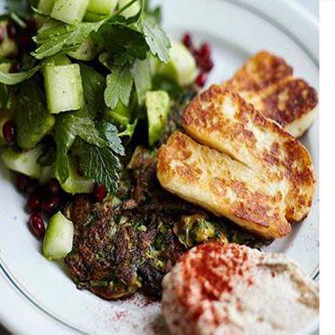 - Laita lautaselle paistetut kesäkurpitsat, halloumi ja salaatti sekä lisäksi nokare jogurttia. Mausta savupaprikajauheella ja tarjoile heti.