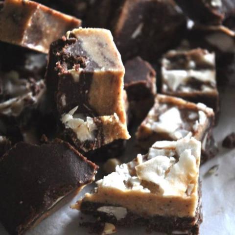Lisää kaikki 2. kerroksen ainekset kookosta lukuun ottamatta kattilaan, ja anna sulaa samalla varovasti sekoittaen. Levitä sulanut seos 1. kerroksen päälle ja koristele halutessasi kookoshiutaleilla. Anna jähmettyä, ja leikkaa levy sopivan kokoisiksi paloiksi. Säilytä jääkaapissa tai pakastimessa.