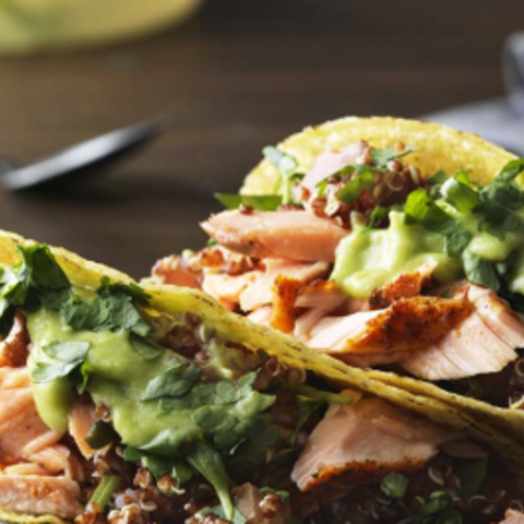 Lisukkeet: Lämmitä tacokuoret uunissa ja täytä kvinoapicolla, lohella ja avokadokastikkeella. Koristele hienonnetulla korianterilla.
