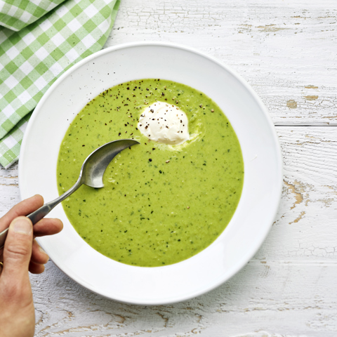 - Soseuta keitto sauvasekoittimella. Lisää kerma ja minttu.