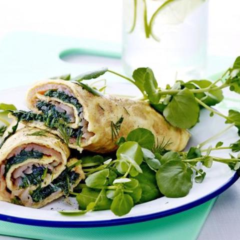 - Paista hyvin ohuet munakkaat tarttumattomalla pannulla ja käytä paistamiseen 1 tl oliiviöljyä.