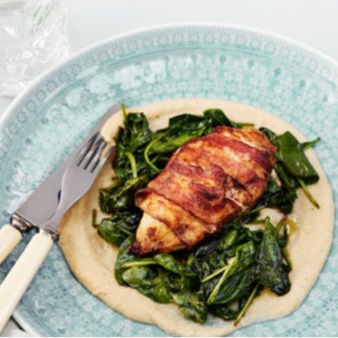 Ihanan mehevä pekoniin kääritty broileri tarjoillaan voissa freesatussa pinaatissa ja uskomattoman maukkaan kukkakaalipyreen ja paahdetun valkosipulin kanssa.