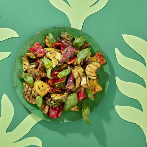 - Kaada tomaatti-valkosipulikastike grillattujen kasvispalojen joukkoon ja sekoita. Maista ja lisää halutessasi suolaa ja mustapippuria. Ripottele loput basilikanlehdet päälle.