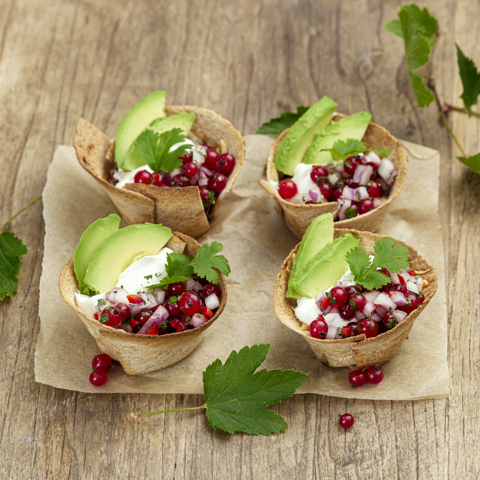 Tacokupit ovat maistuva välipala tai vaikka leffaillan herkku. Salsa tehdään tomaatin sijaan raikkaan happamista herukoista!