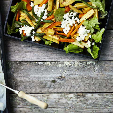 Tämän täyttävän salaatin uunijuurekset sekä proteiininlähteet pitävät kylläisenä.