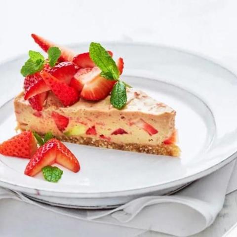 - Leikkaa loput mansikat paloiksi ja sekoita ne seokseen. Kaada täyte pohjan päälle, peitä kelmulla ja laita jääkaappiin noin 2 tunniksi.