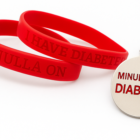 Meillä on myös saatavana kätevä diabetesranneke, joka on punaista silikonia, ja se sopii matkalle tai täydentämään kaulakorua. Rannekkeessa on painettu teksti siitä, että kantajalla on diabetes, sekä suomeksi että englanniksi. Aikuisille (20 cm ympärys).